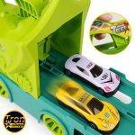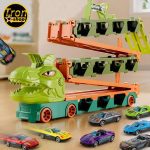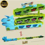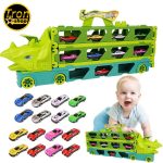 Jednostavnim pritiskom na dugme na glavi dinosaurusa, ovaj kamion za transport automobila igračke može se brzo pretvoriti u trkačku stazu od preko 2metra sa prelijepim vozilima od legure koja se mogu utovariti u kamion ili trkati sa prijateljima.